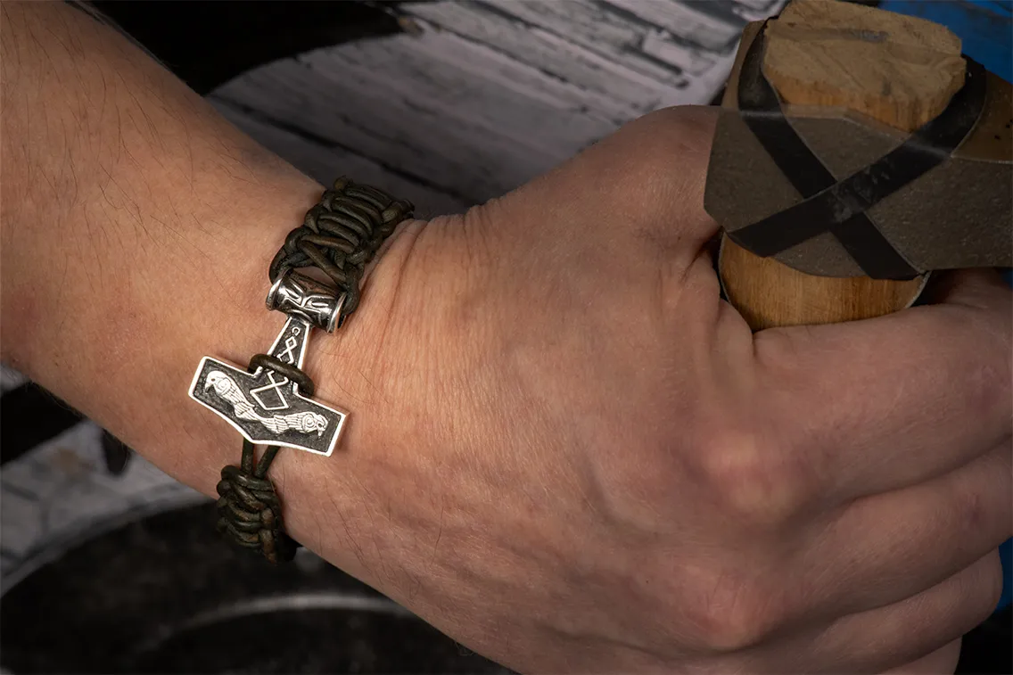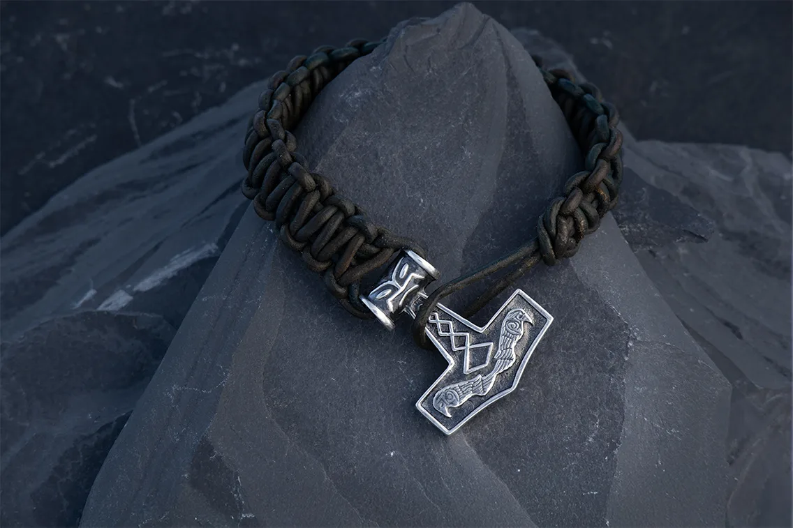 Læderarmbånd med Thors Hammer udsmykket med Odins Ravne