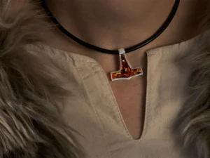 Læderarmbånd, der kombinerer rå styrke og dyb symbolik. Armbåndet er prydet med en Thors hammer i 925S sterlingsølv, smukt udsmykket med Odins vise ravne, Hugin og Munin. Disse to legendariske væsener symboliserer tanke og hukommelse, hvilket gør dette armbånd til et stærkt statement for den moderne viking. Læs eventuelt mere om Thors hammer her.