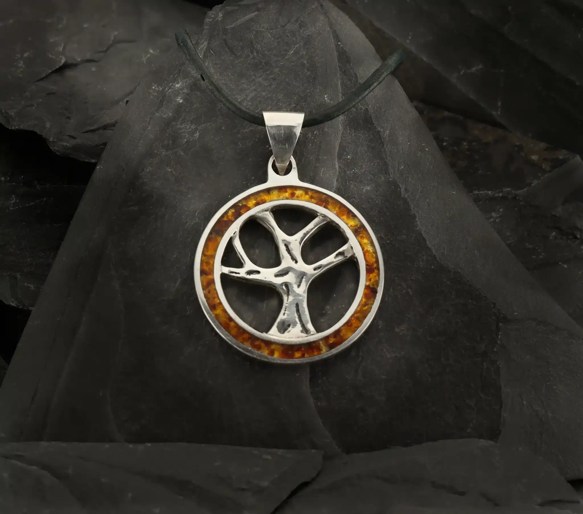 Ravets varme glød repræsenterer solens kraft og naturens energi, mens sølvet giver smykket et tidløst, vikingeinspireret udtryk. Et perfekt valg til dig, der bærer nordisk kultur, mytologi og håndværk tæt på hjertet.